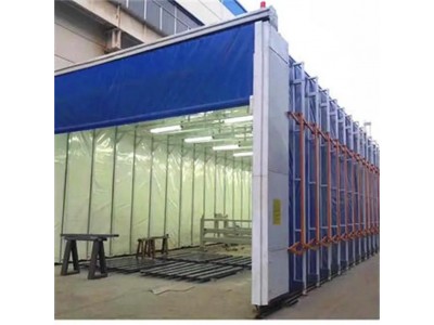 移动伸缩前室由钢架结构和阻燃PVC布组成,通过平行四边形连杆机构或轨道驱动系统实现自动展开与合拢。工作时,前室沿轨道平滑移动至工件上方,形成封闭/半封闭空间进行喷漆;完成后收缩至一侧,节省空间并实现多工序共用场地。其核心系统包括: